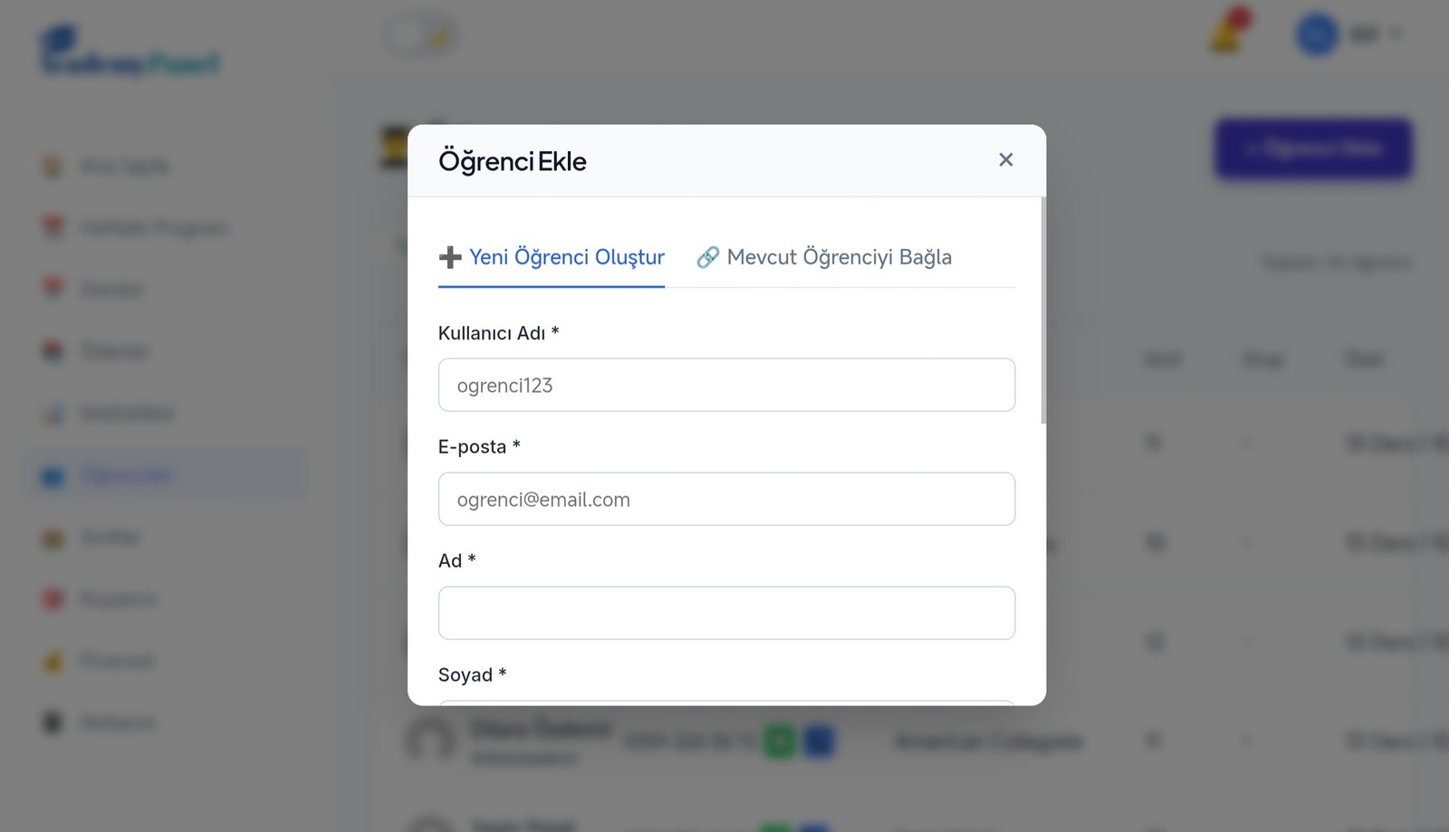 Öğrenci hesabı oluşturmak ve Mevcut Öğrenci Hesabını Bağlamak